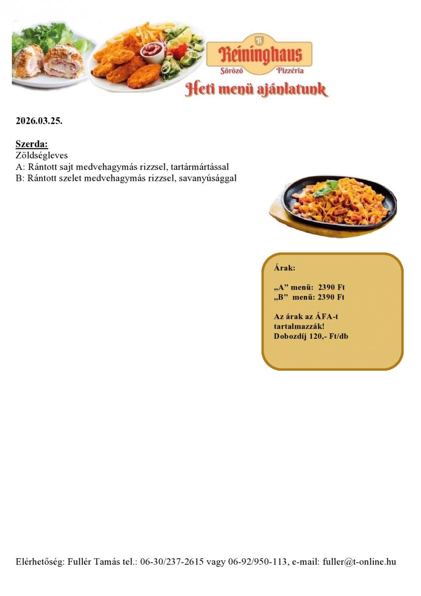 B: Rántott szelet medvehagymás rizzsel, savanyúsággal